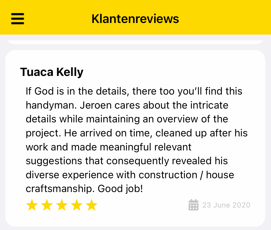 Although I am a tropical biologist, I have choosen to work as an independent handyman 10 years ago, so that I can combine it with my passion for travelling. My inquisitive mind – as a child I loved to break down and rebuild – and a father in architecture, have brought me hands that can fix almost anything and an eye for design. I love to solve problems, repair, create and design.