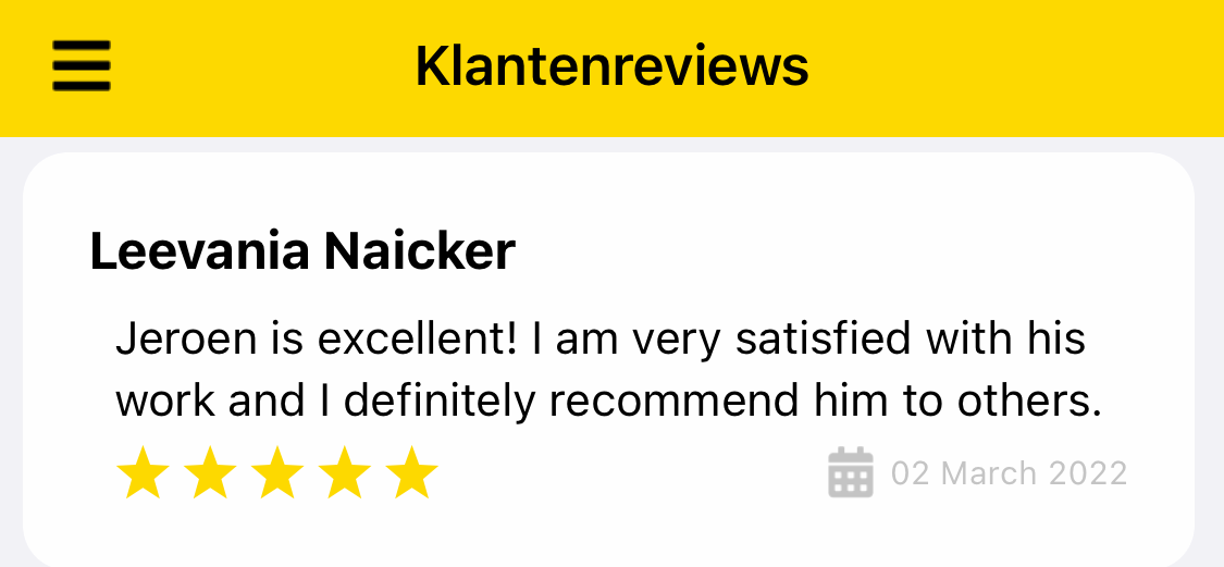 I work for private and business clients in the Amsterdam region (approx. 30 km).